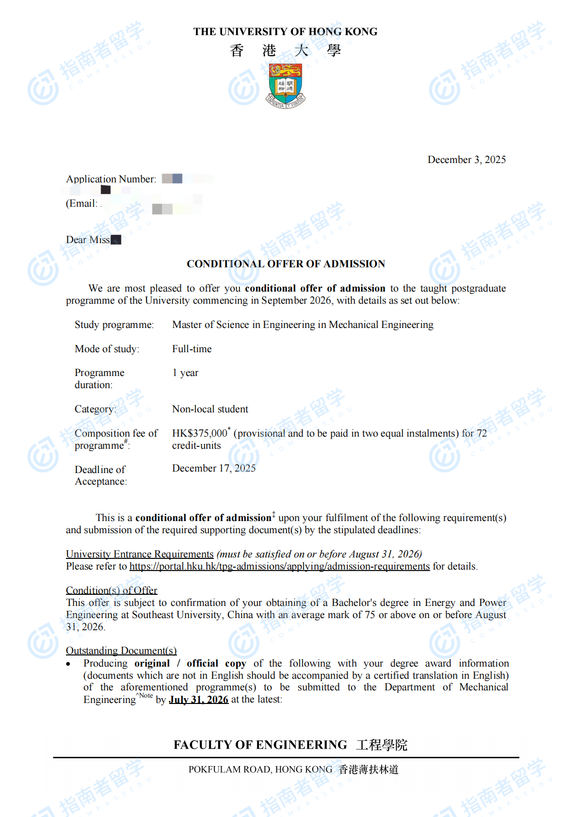 香港大学机械工程(工程)理学硕士研究生offer一枚