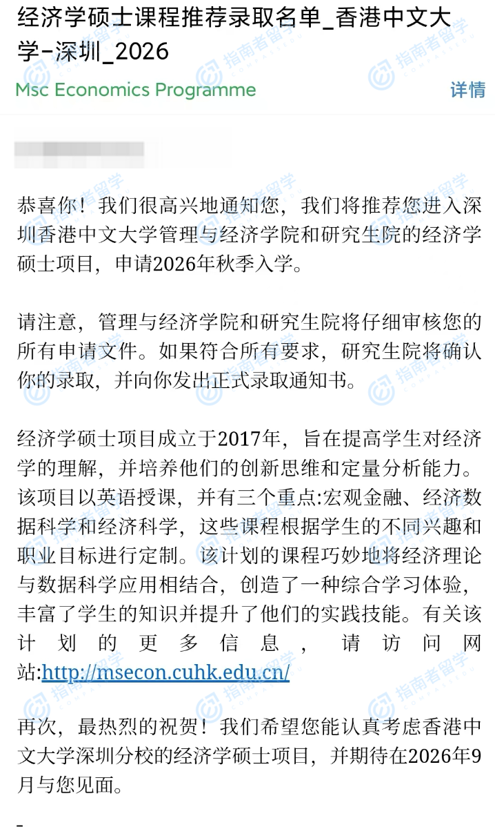 香港中文大学经济学理学硕士(CUHK-Shenzhen)研究生offer一枚