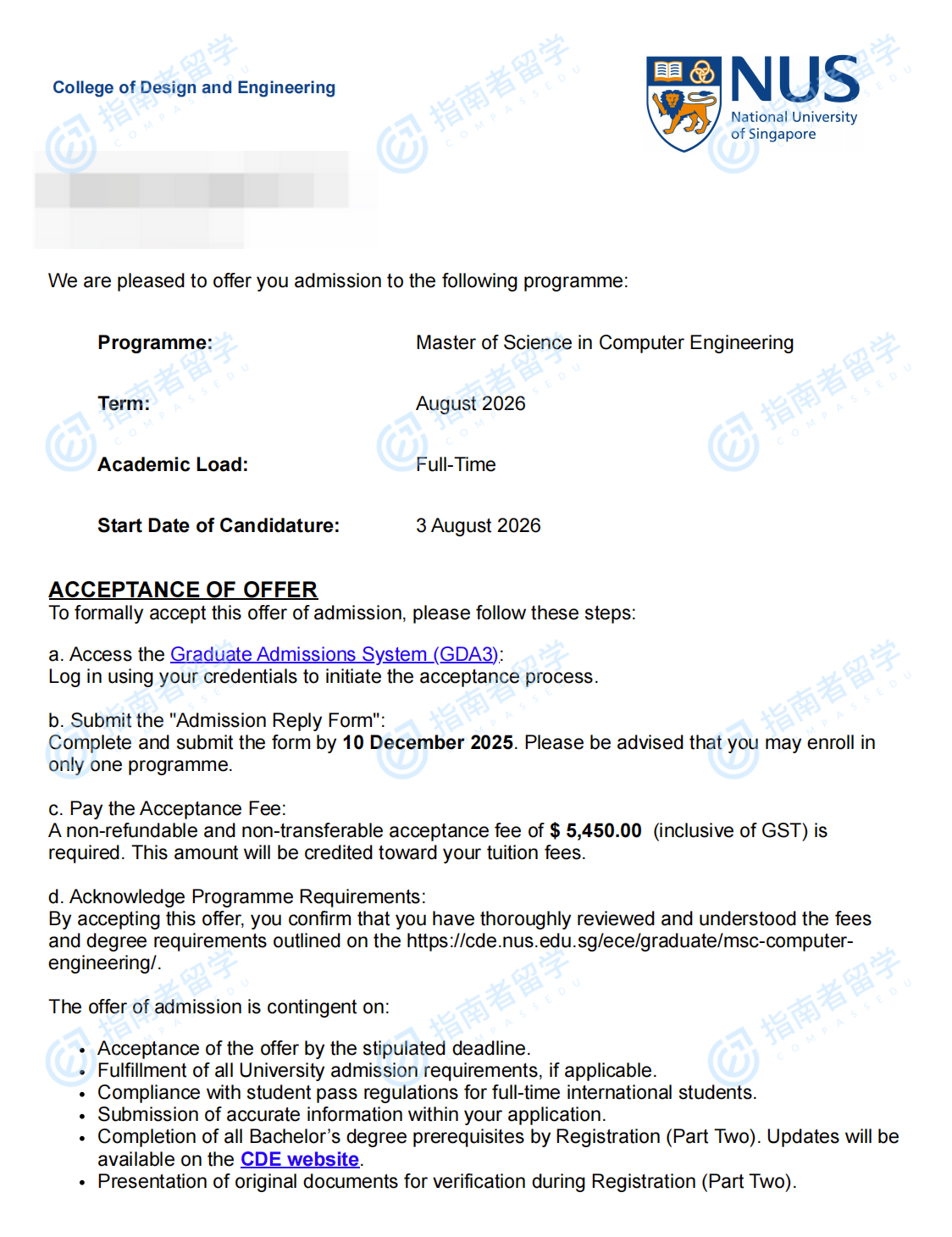 新加坡国立大学计算机工程理学硕士 - 通识方向研究生offer一枚