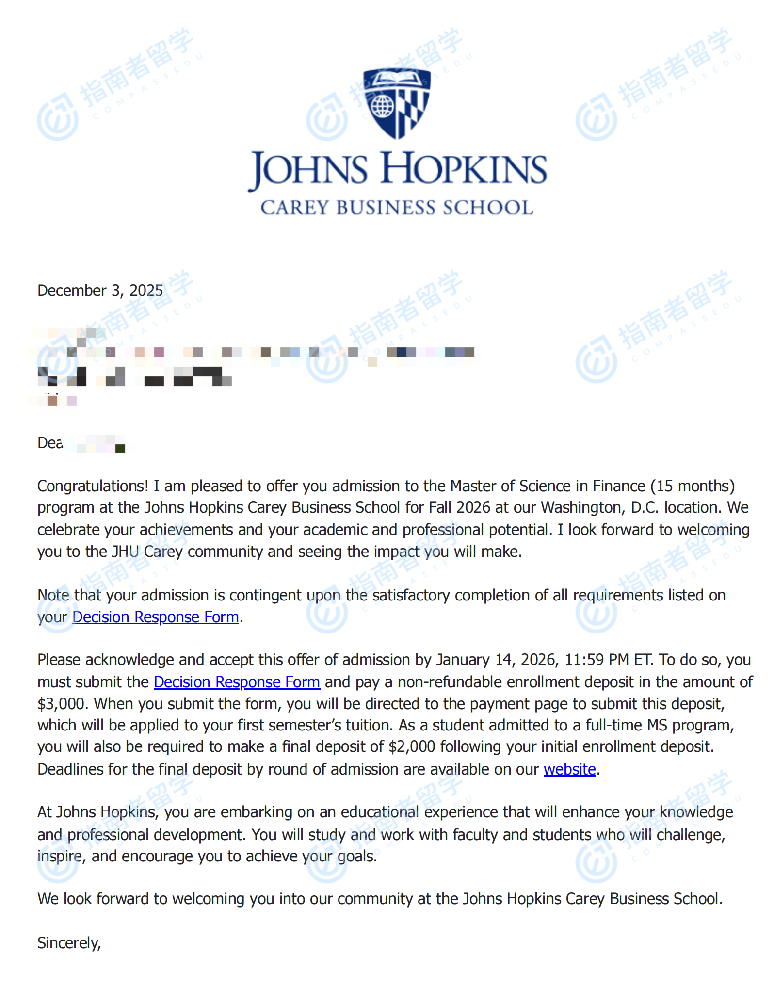 约翰霍普金斯大学金融硕士研究生offer一枚