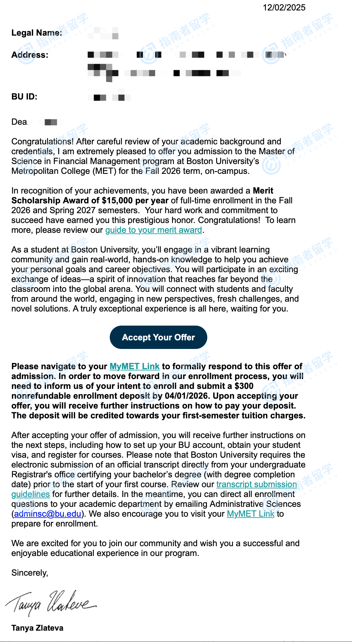 波士顿大学金融管理硕士研究生offer一枚