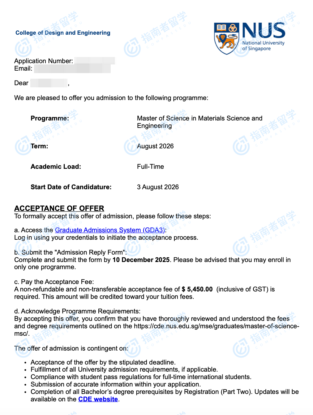 新加坡国立大学材料科学与工程理学硕士研究生offer一枚