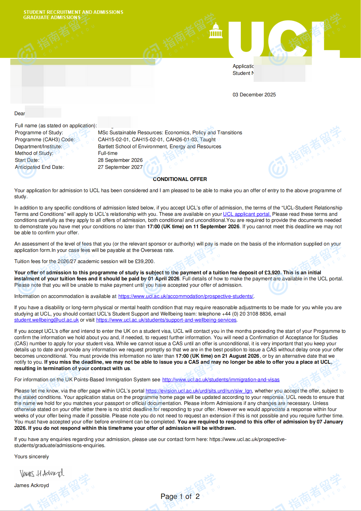 伦敦大学学院可持续资源:经济、政策与转型理学硕士研究生offer一枚