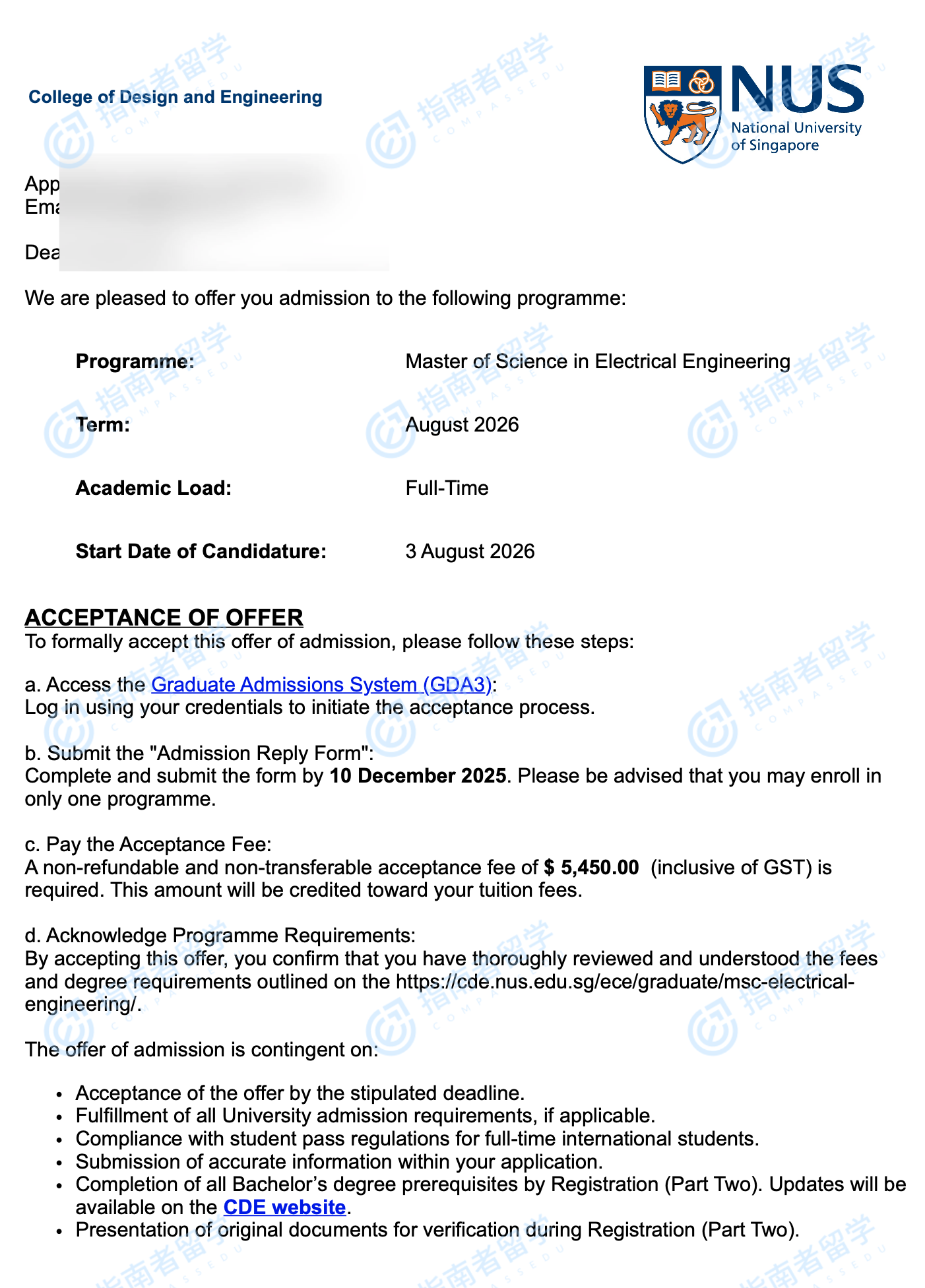 新加坡国立大学电气工程理学硕士研究生offer一枚