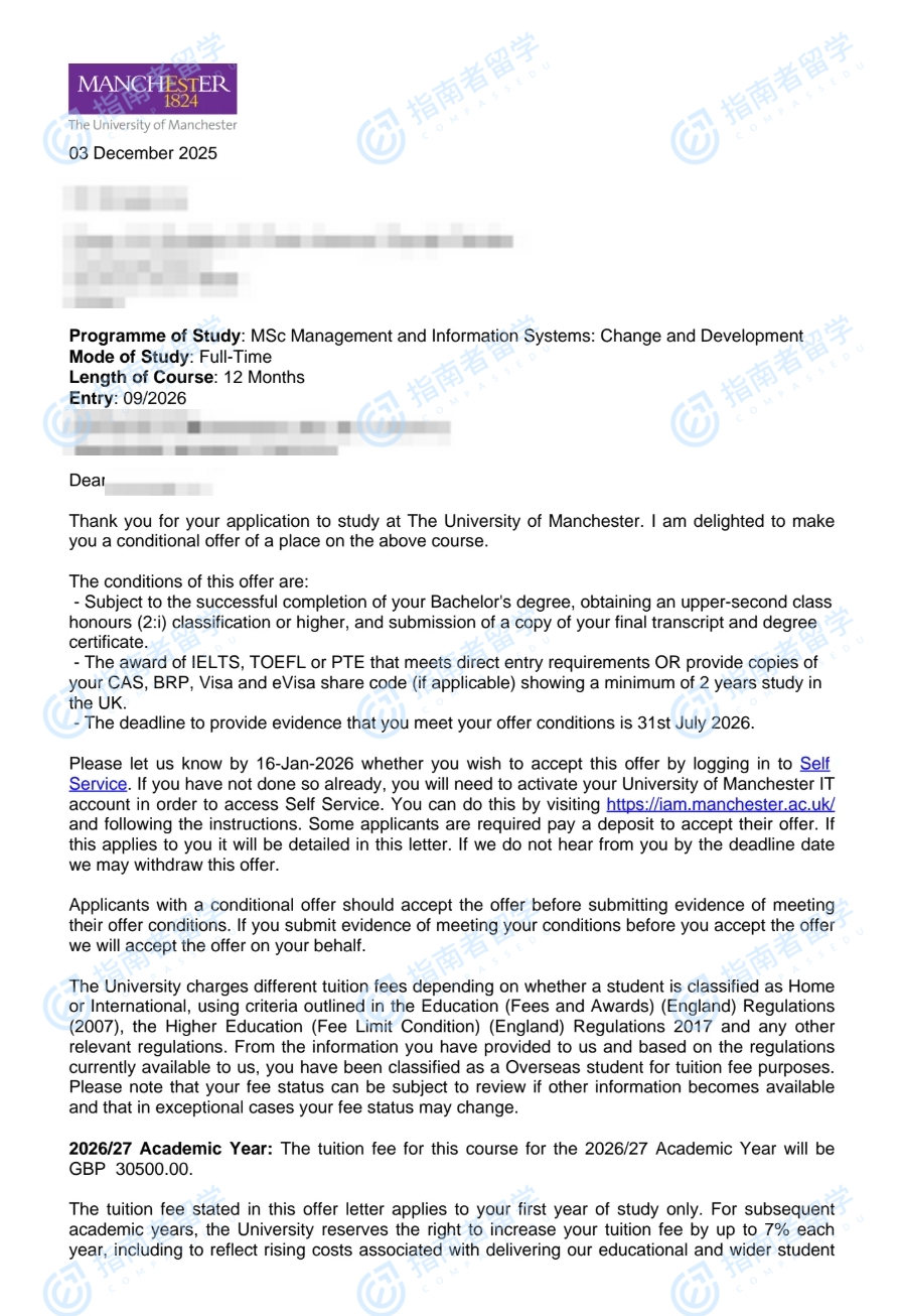 曼彻斯特大学管理与信息系统:变化与发展理学硕士研究生offer一枚