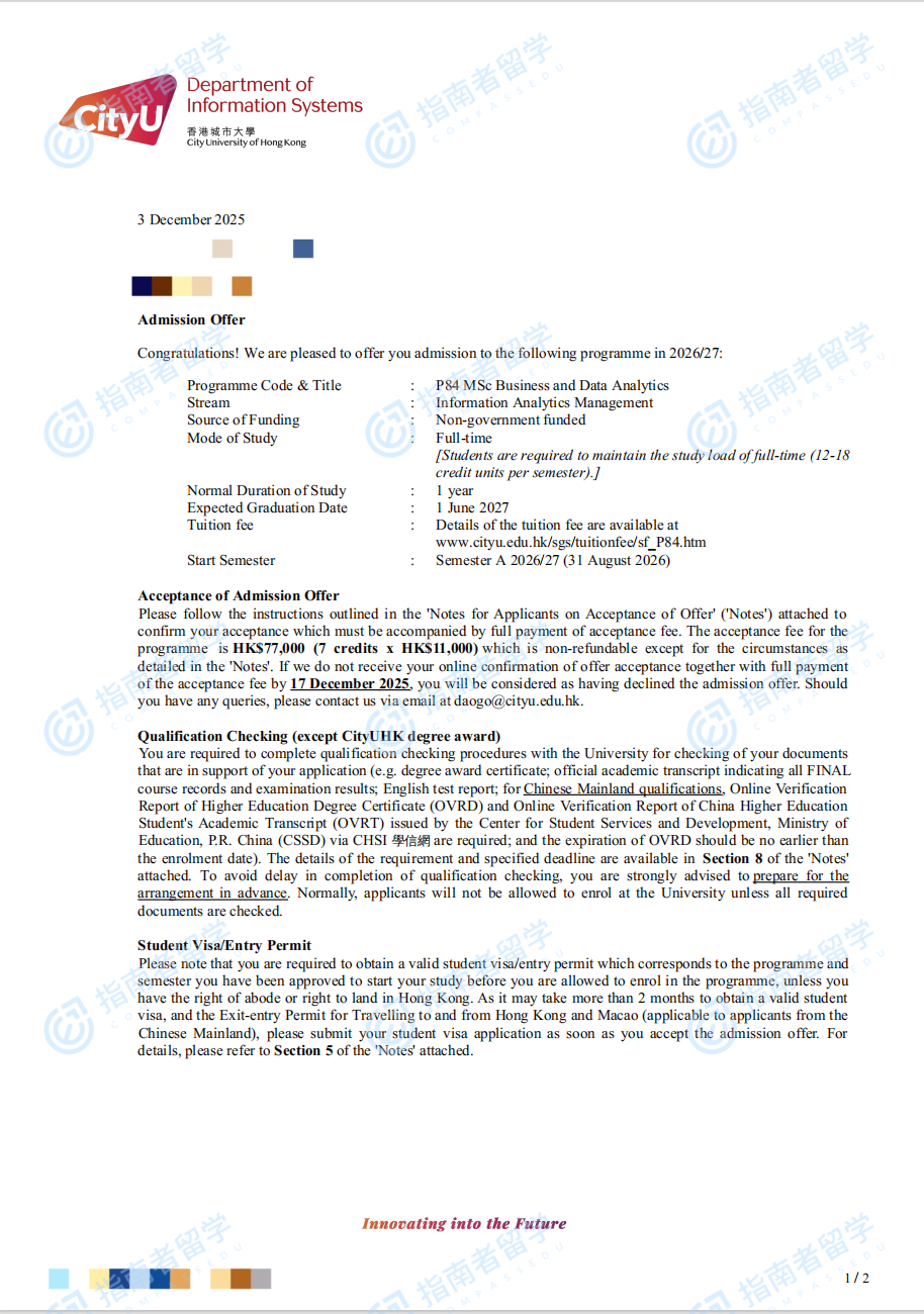 香港城市大学商业及数据分析理学硕士研究生offer一枚