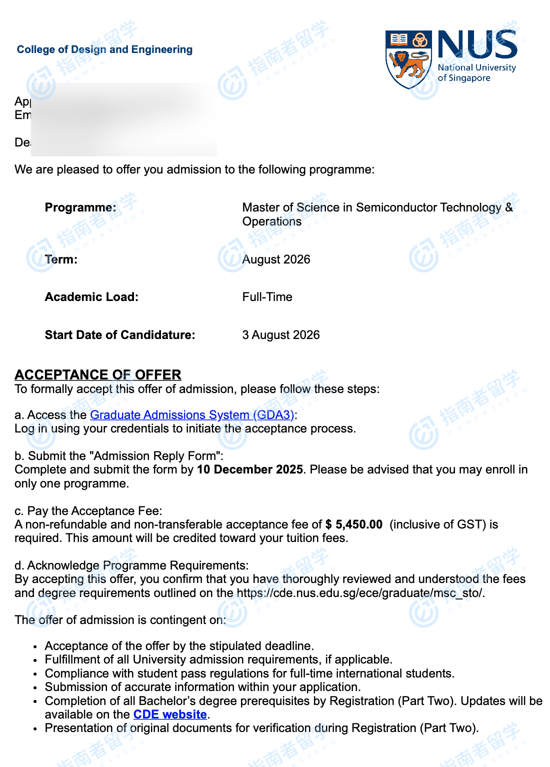 新加坡国立大学半导体技术与运作理学硕士研究生offer一枚