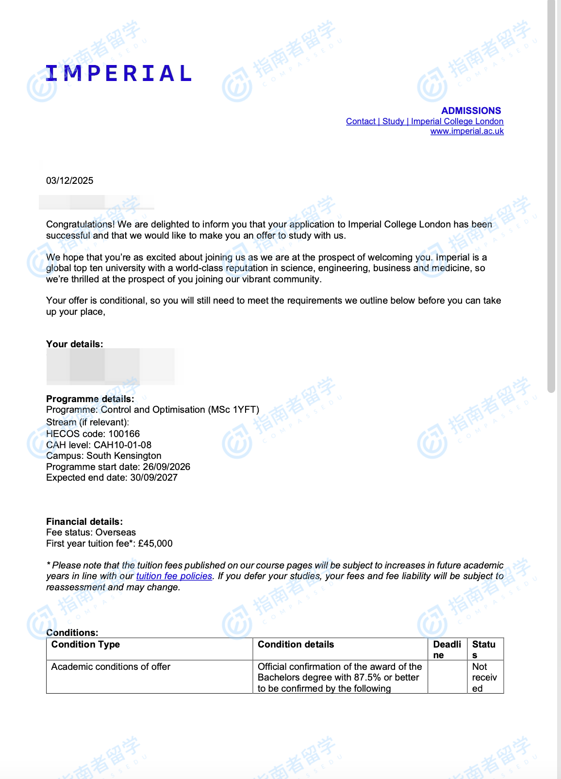 帝国理工学院控制与优化理学硕士研究生offer一枚