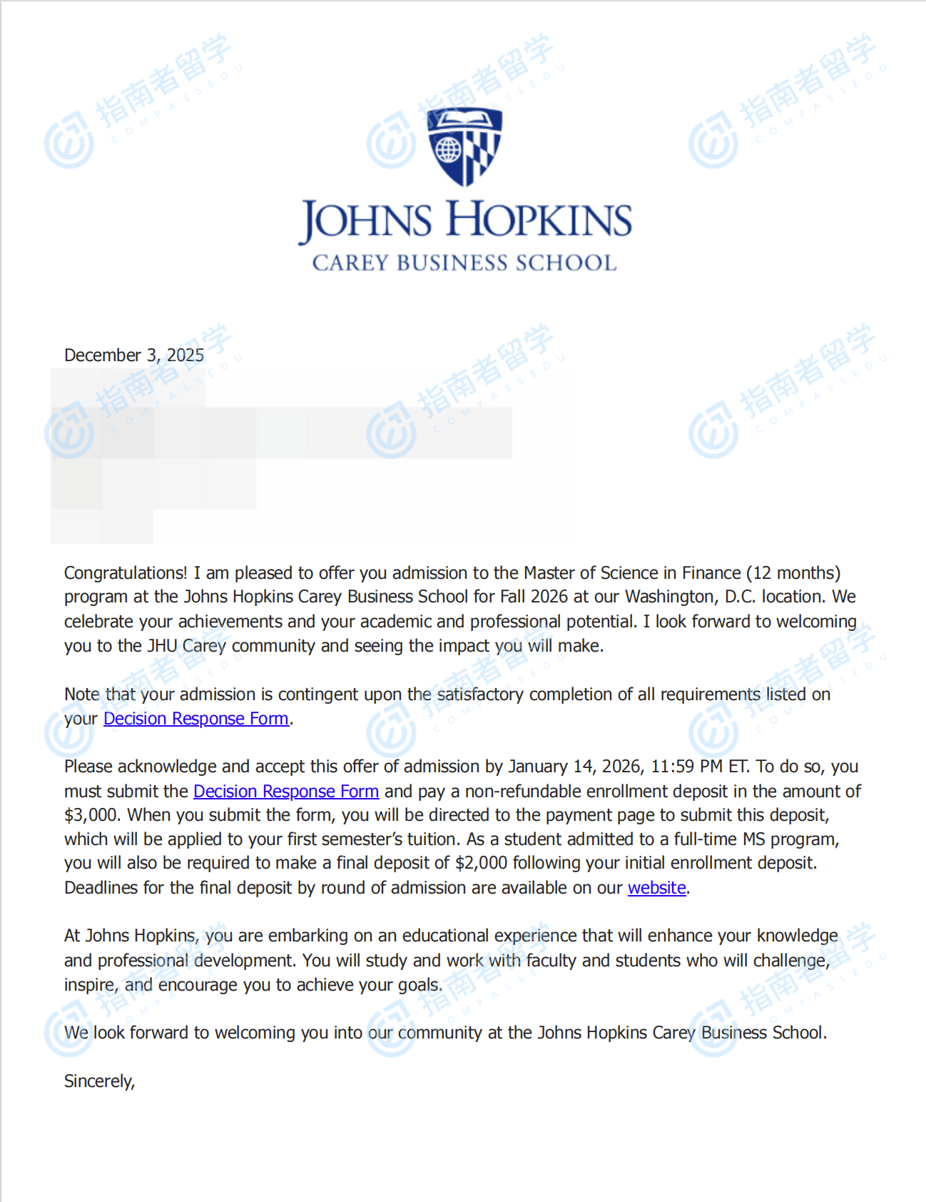 约翰霍普金斯大学金融硕士研究生offer一枚