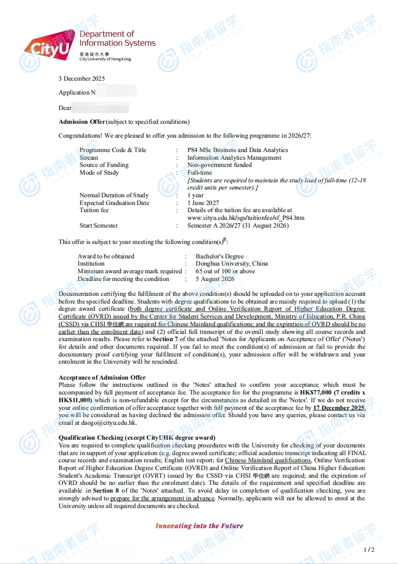 香港城市大学商业及数据分析理学硕士研究生offer一枚