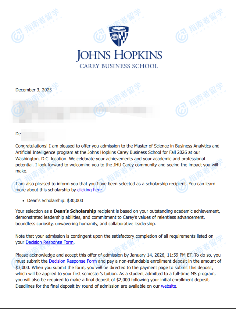 约翰霍普金斯大学商业分析与人工智能硕士研究生offer一枚