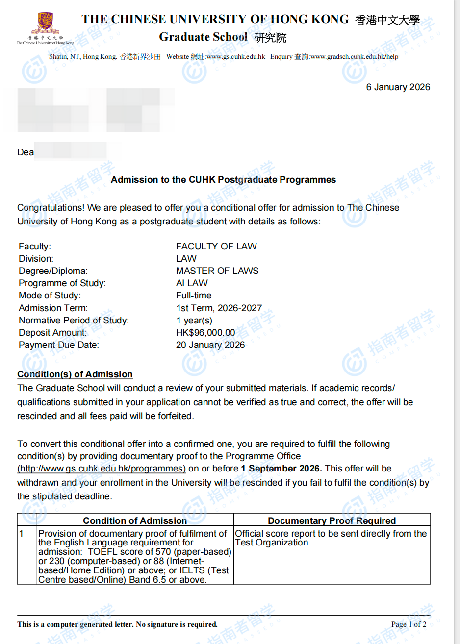 香港中文大学人工智能法法学硕士研究生offer一枚