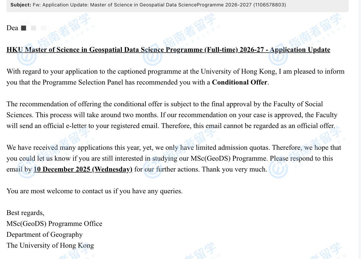香港大学地理空间数据科学理学硕士研究生offer一枚