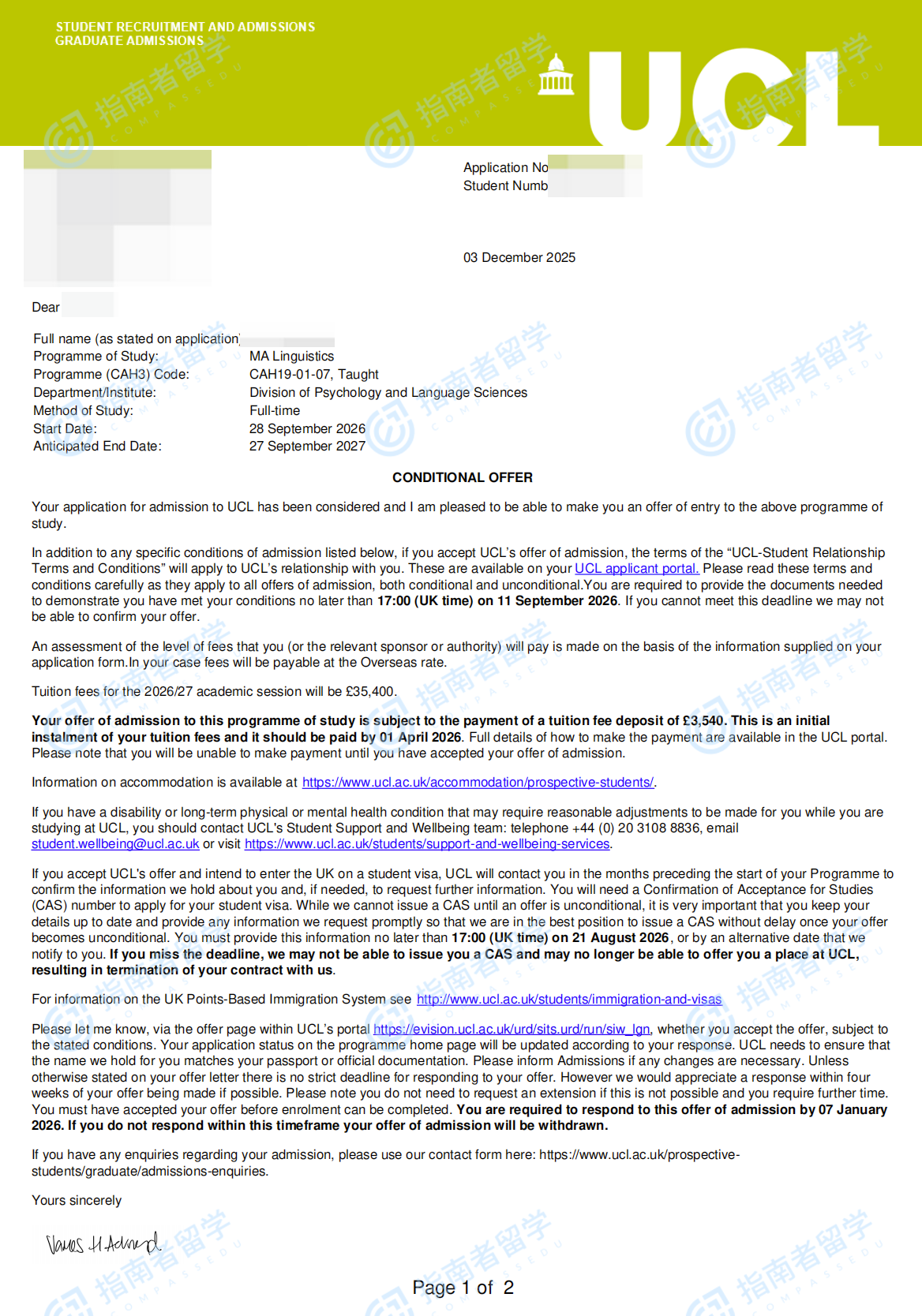 伦敦大学学院语言学文学硕士研究生offer一枚