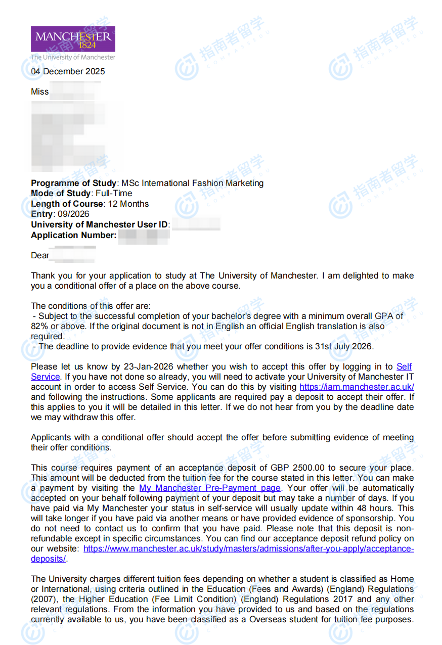 曼彻斯特大学国际时尚营销理学硕士研究生offer一枚
