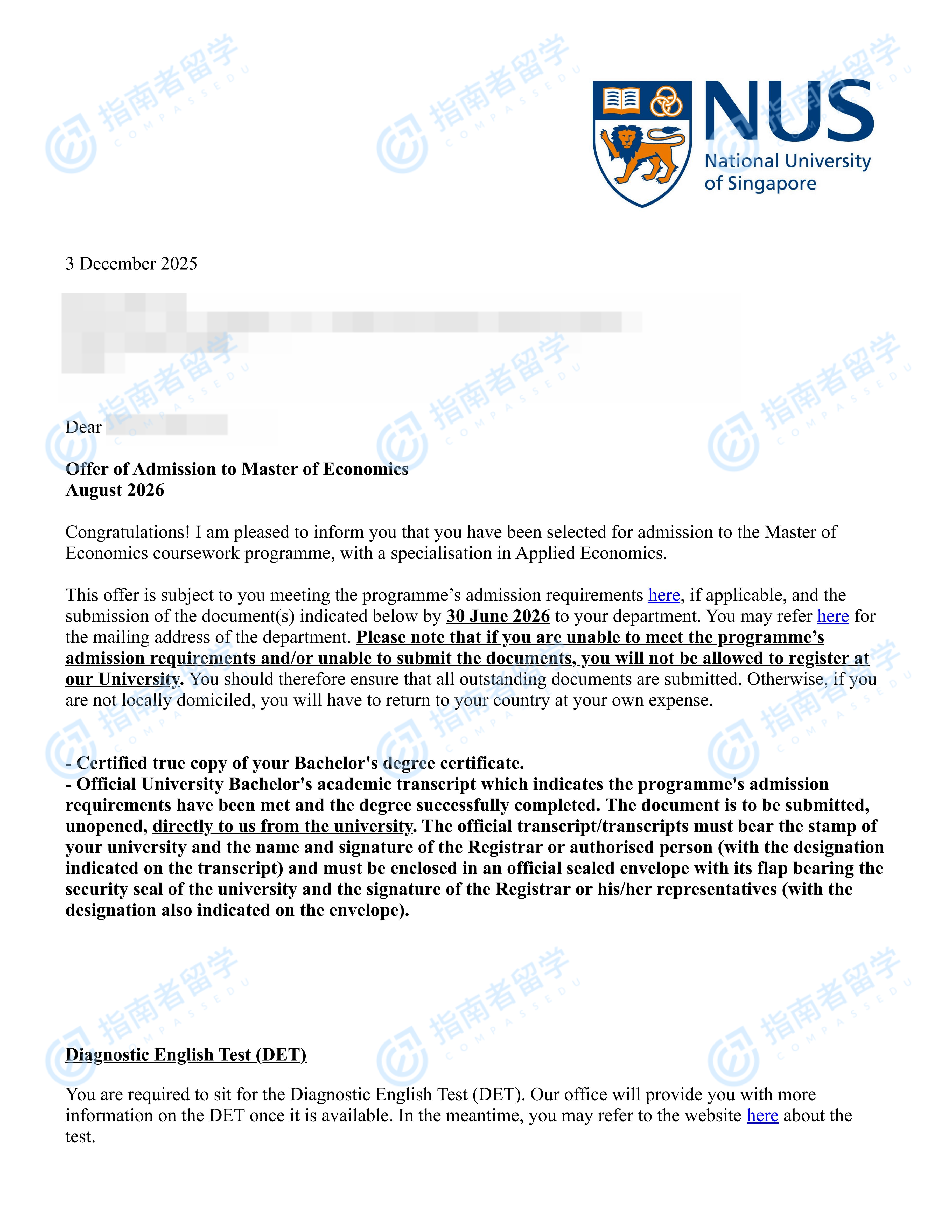 新加坡国立大学经济学硕士研究生offer一枚