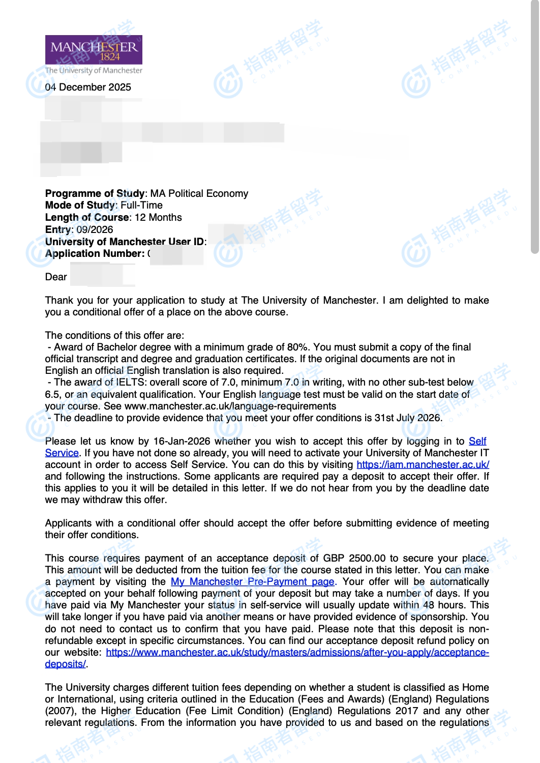 曼彻斯特大学政治经济学文学硕士(标准)研究生offer一枚