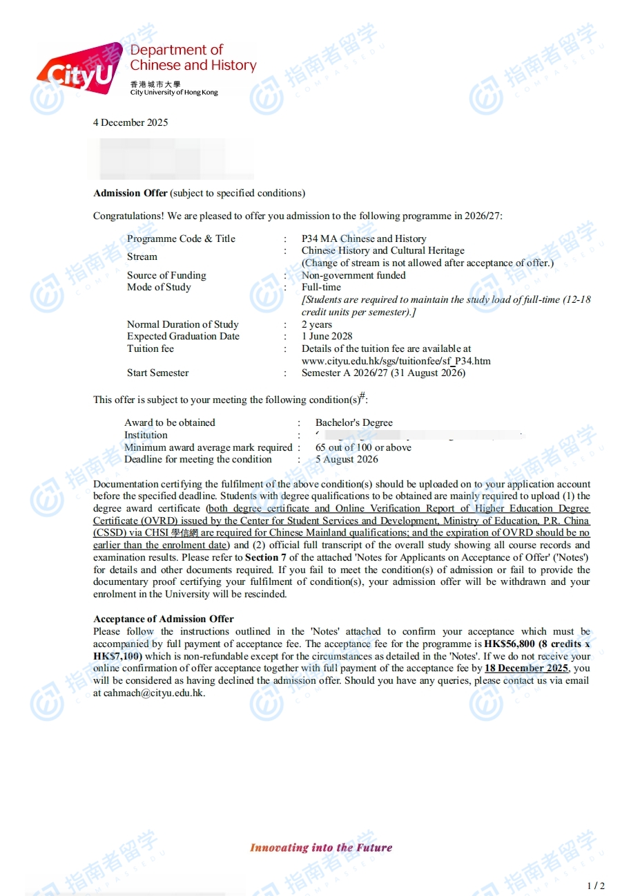 香港城市大学中国语言文学与历史文学硕士研究生offer一枚