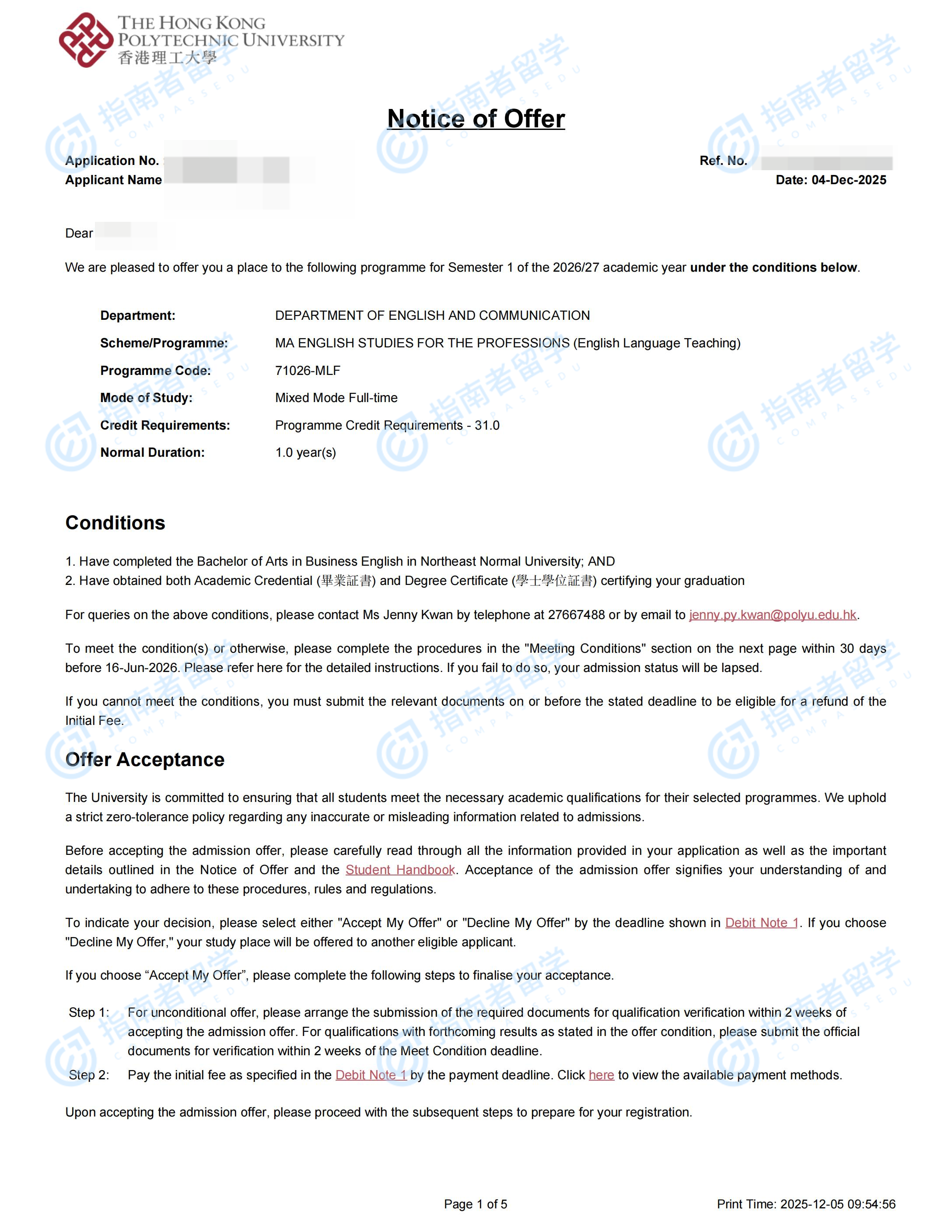 香港理工大学专业英文文学硕士(英语教学)研究生offer一枚