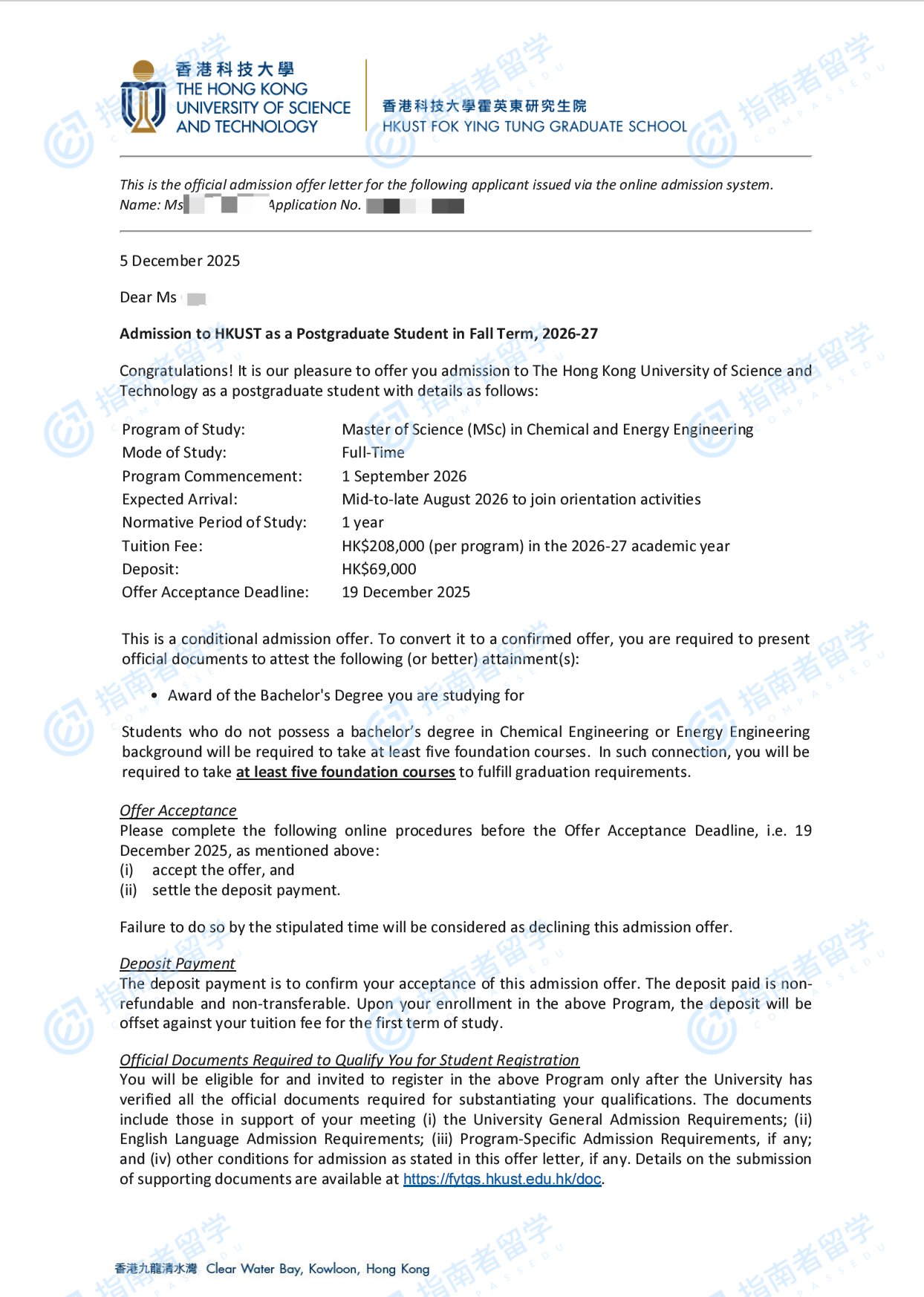 香港科技大学化学与能源工程理学硕士研究生offer一枚