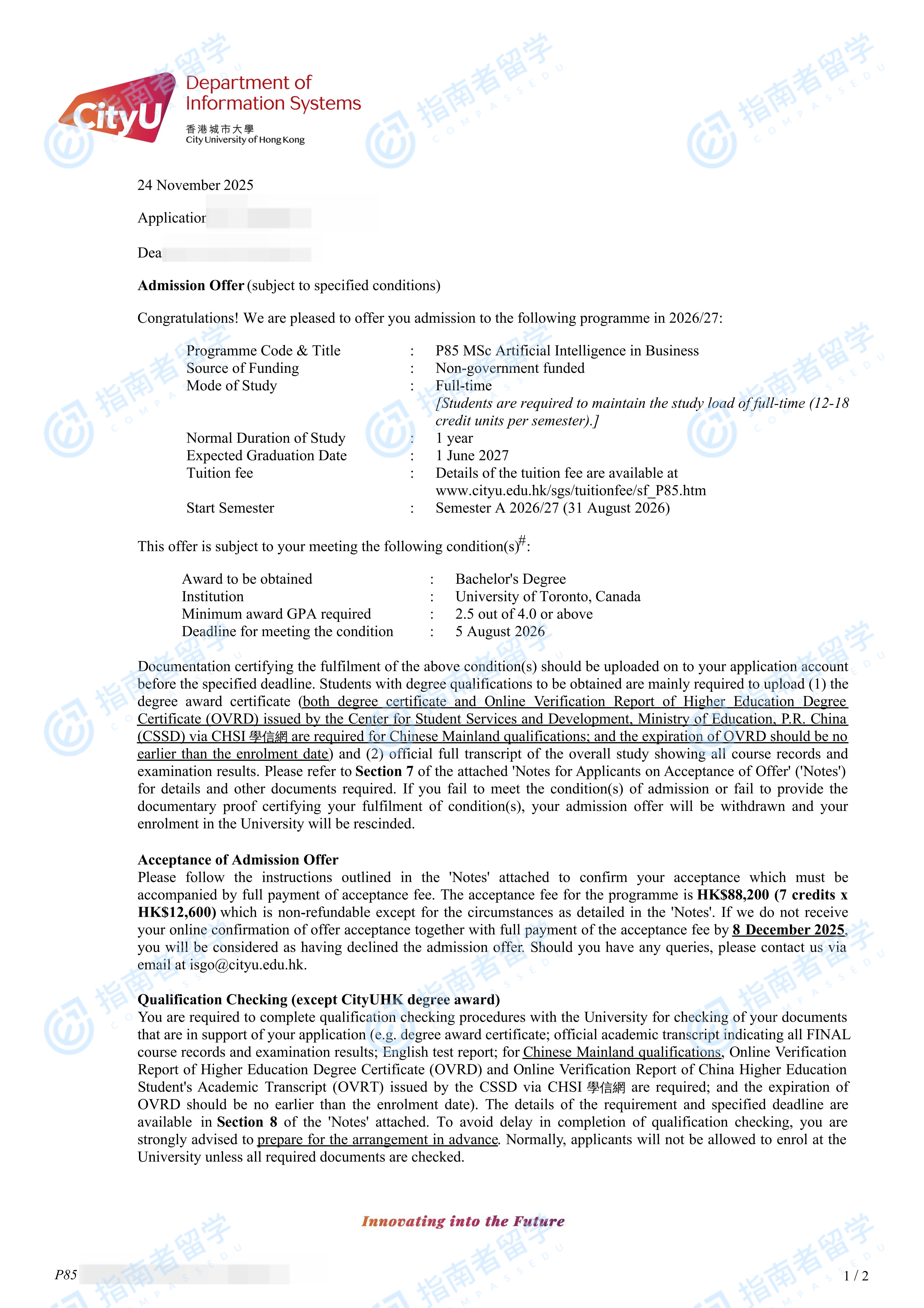 香港城市大学商业人工智能理学硕士研究生offer一枚