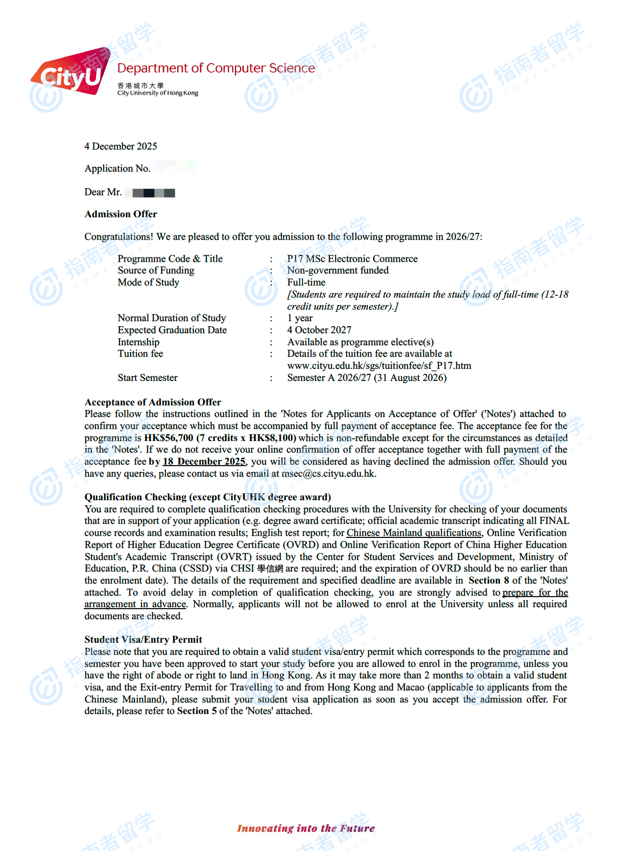 香港城市大学电子商贸理学硕士研究生offer一枚