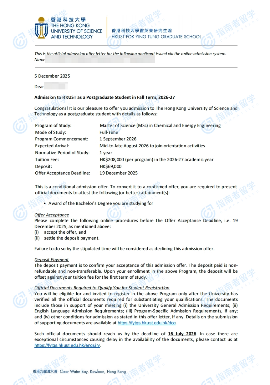 香港科技大学化学与能源工程理学硕士研究生offer一枚