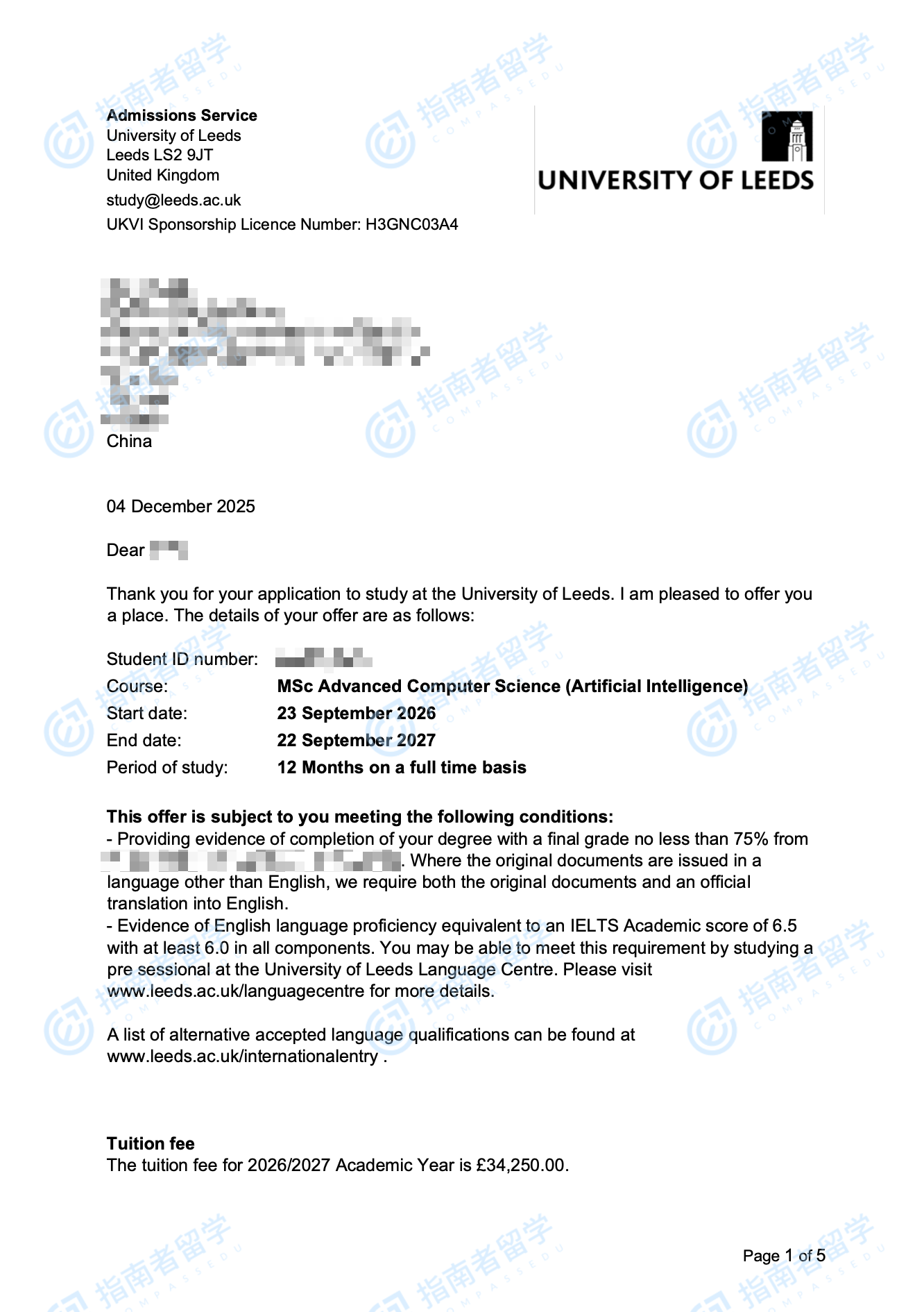 利兹大学高级计算机科学(人工智能)理学硕士研究生offer一枚