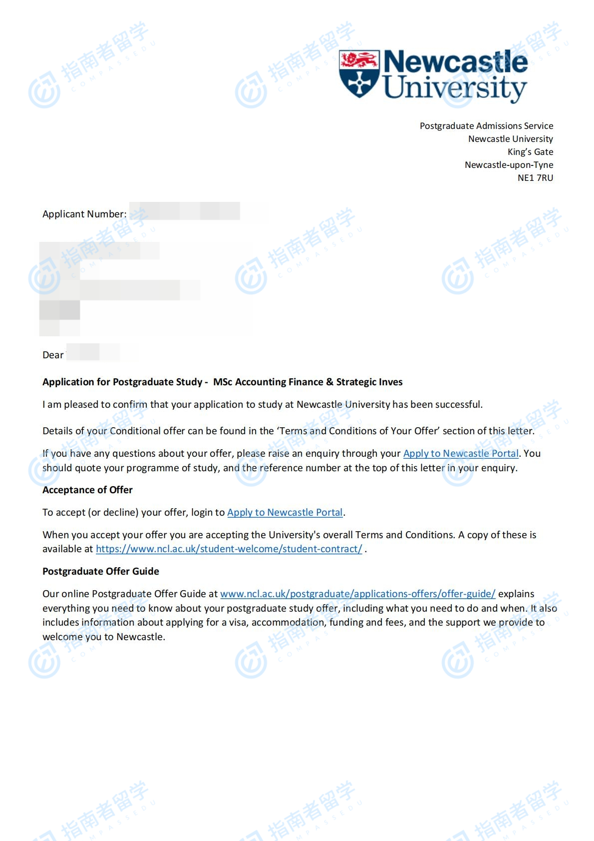 纽卡斯尔大学(英国)会计、金融与战略投资理学硕士研究生offer一枚
