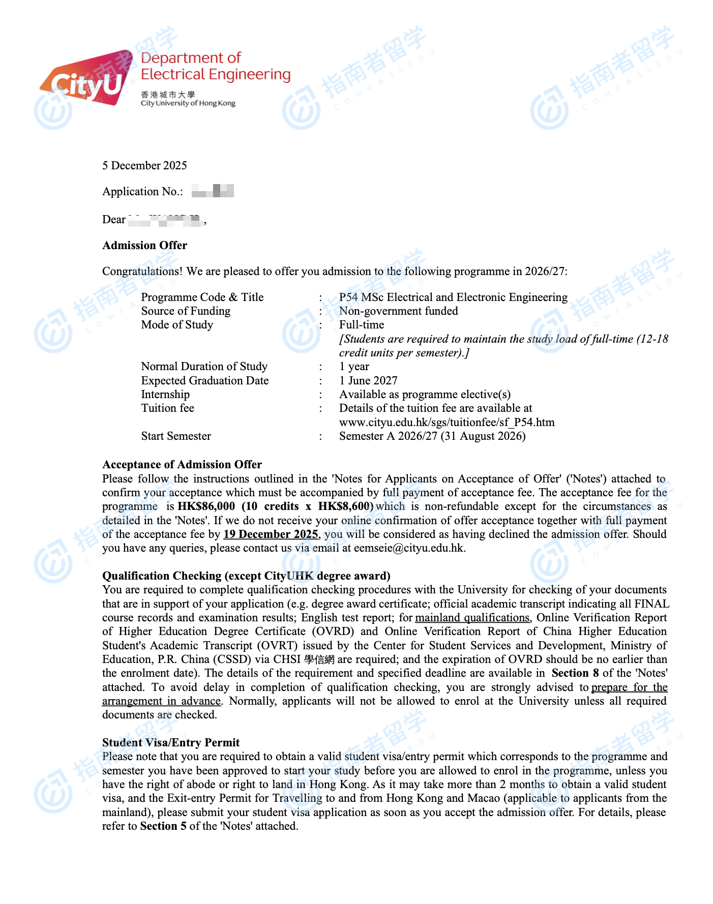 香港城市大学电机与电子工程学理学硕士研究生offer一枚