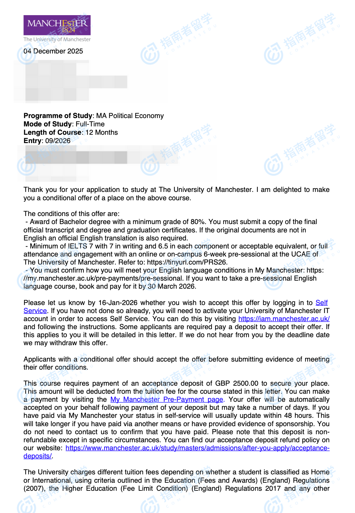 曼彻斯特大学政治经济学文学硕士(标准)研究生offer一枚