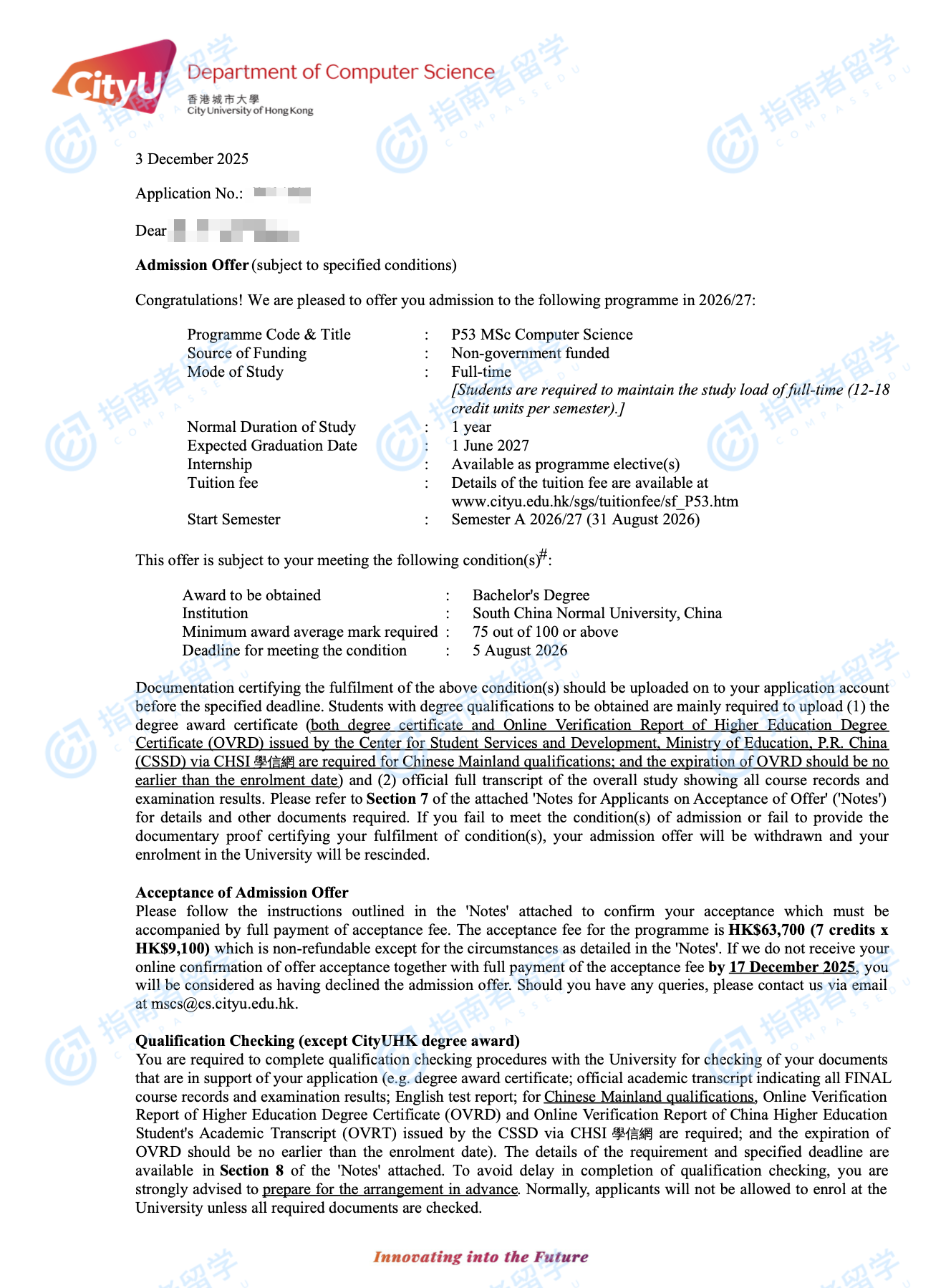 香港城市大学计算机科学理学硕士研究生offer一枚