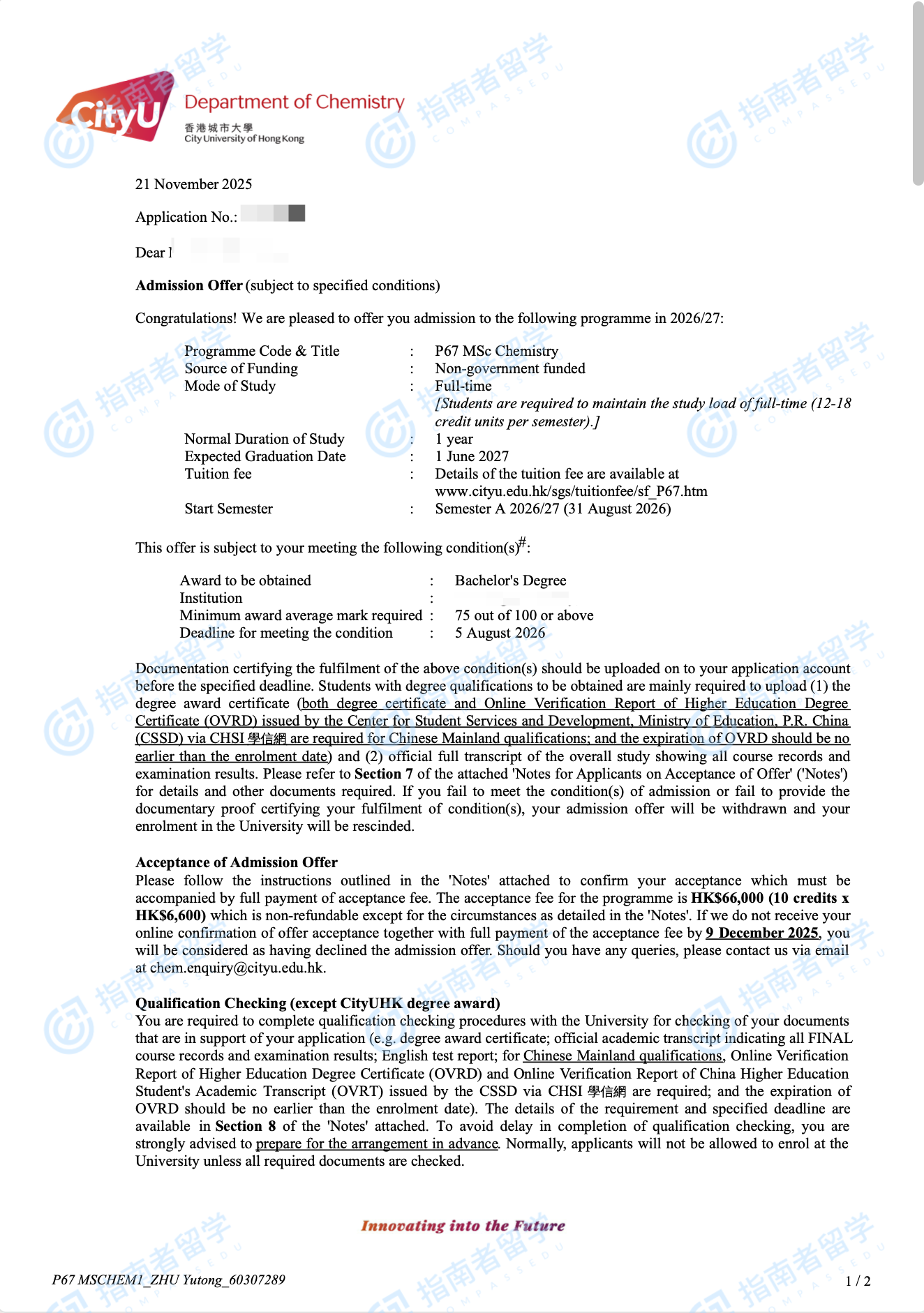 香港城市大学化学理学硕士研究生offer一枚
