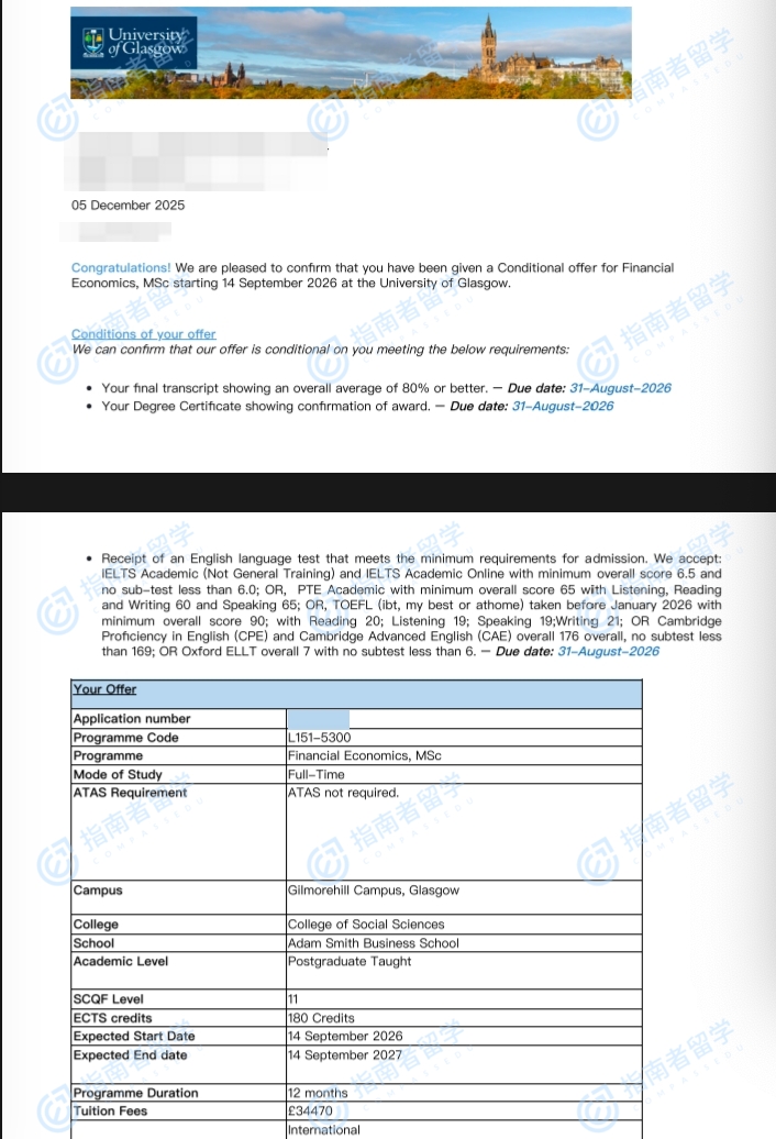 格拉斯哥大学金融经济学理学硕士研究生offer一枚