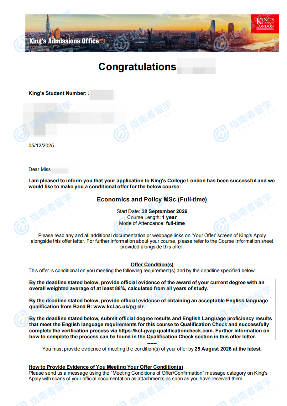 伦敦大学国王学院经济与政策理学硕士研究生offer一枚