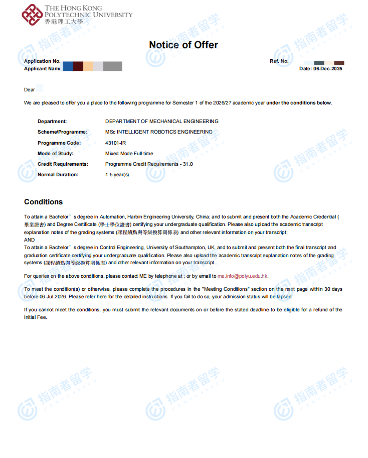 香港理工大学智能机器人工程理学硕士研究生offer一枚
