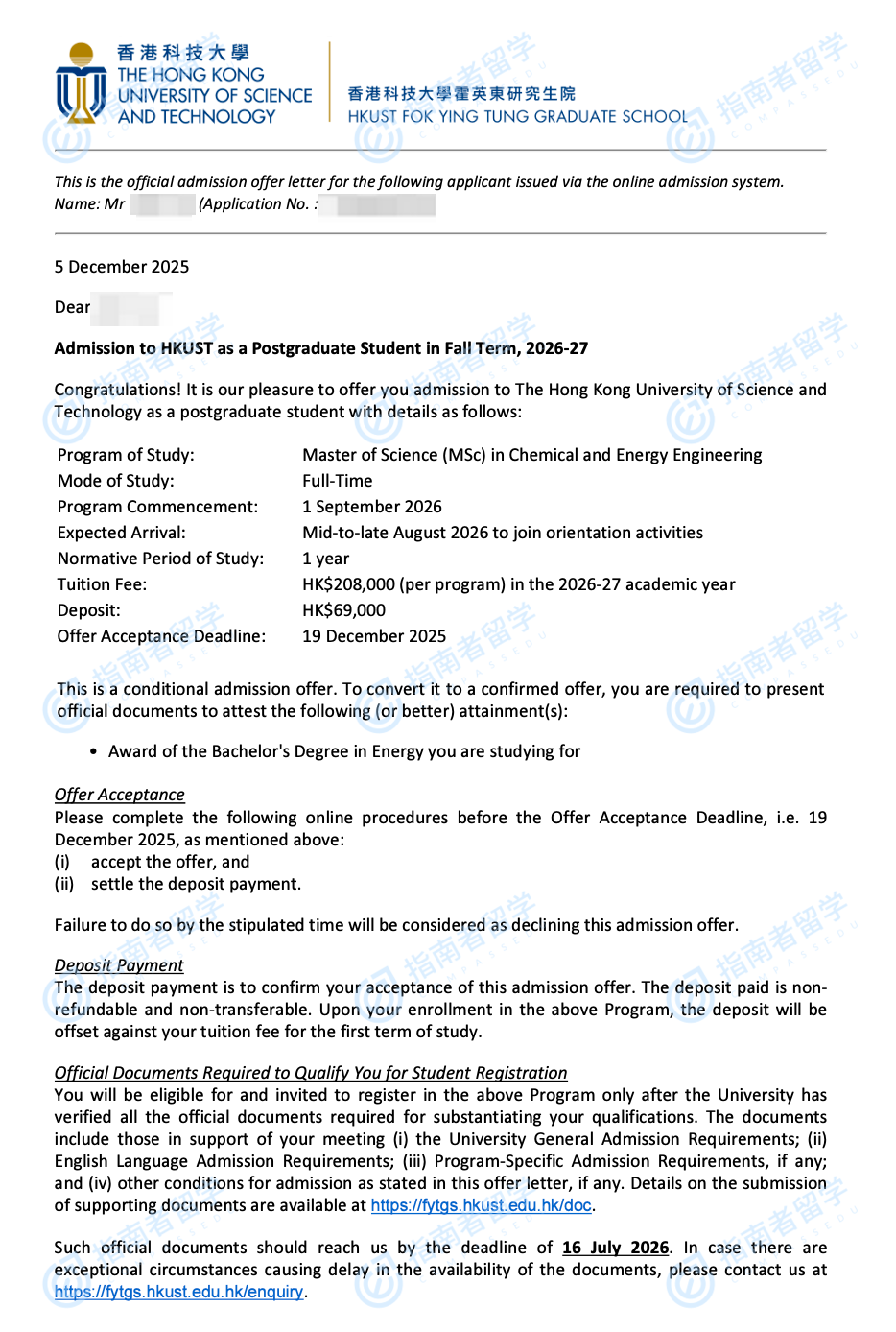 香港科技大学化学与能源工程理学硕士研究生offer一枚