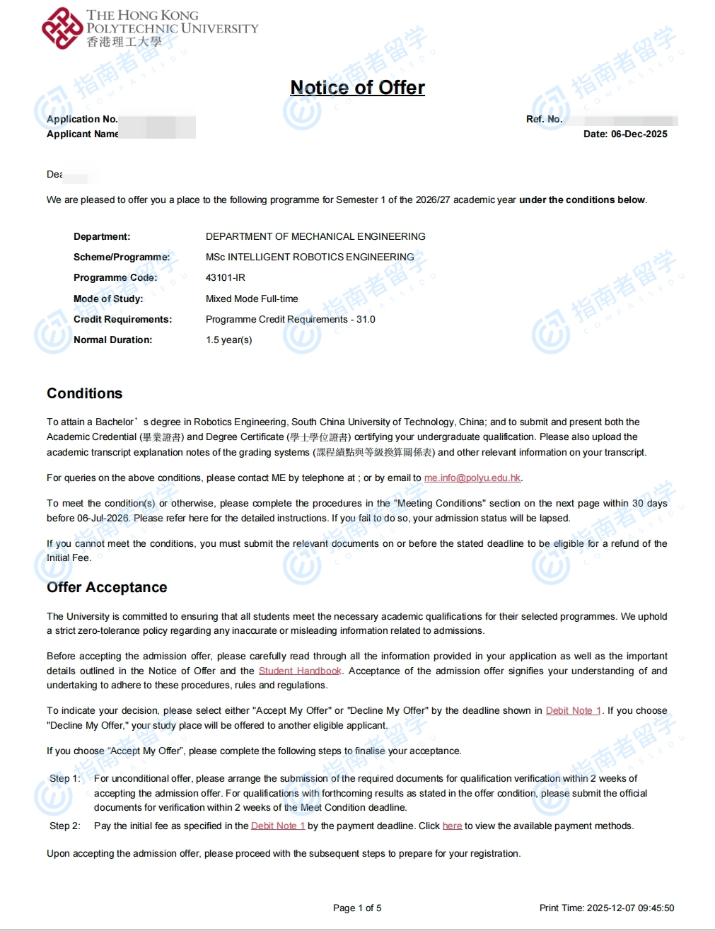 香港理工大学智能机器人工程理学硕士研究生offer一枚