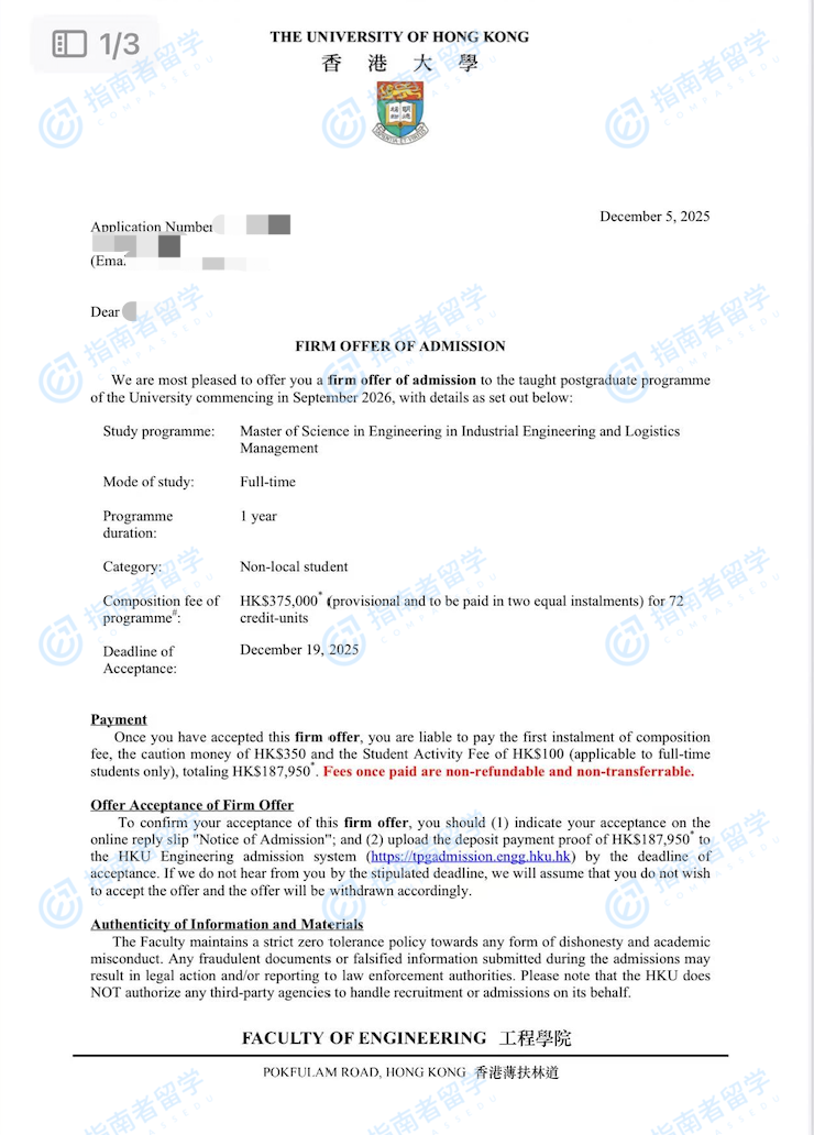 香港大学工业工程与物流管理(工程)理学硕士研究生offer一枚