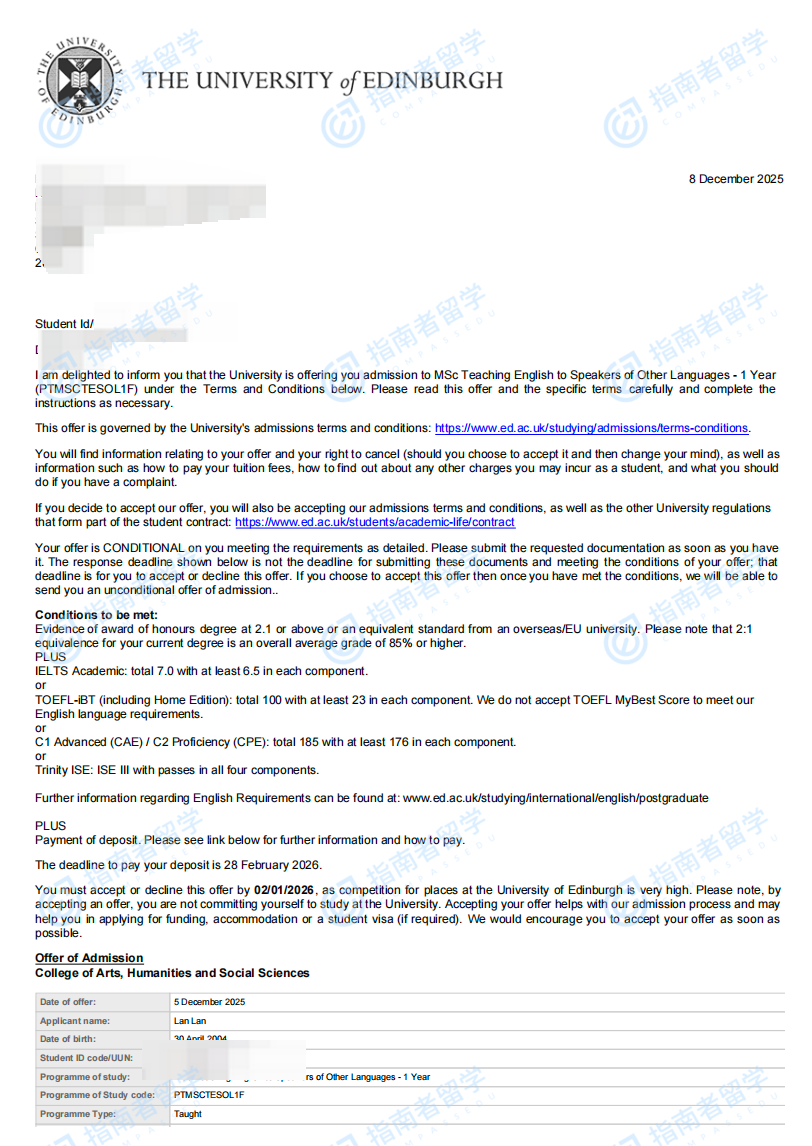 爱丁堡大学对外英语教学理学硕士研究生offer一枚