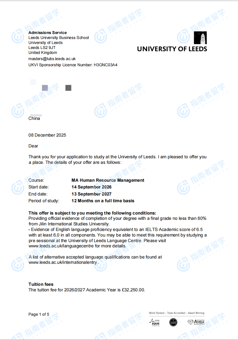 利兹大学人力资源管理文学硕士研究生offer一枚