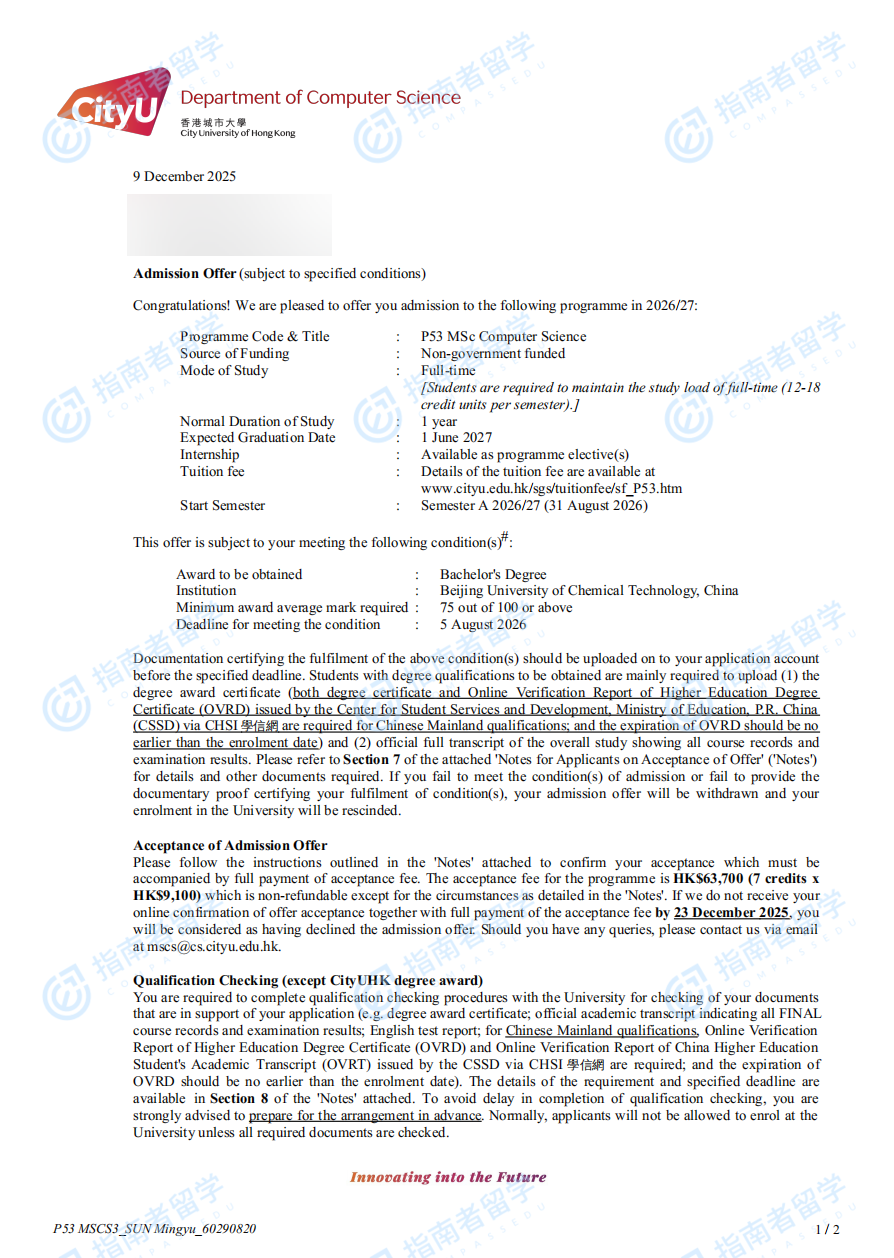 香港城市大学计算机科学理学硕士研究生offer一枚