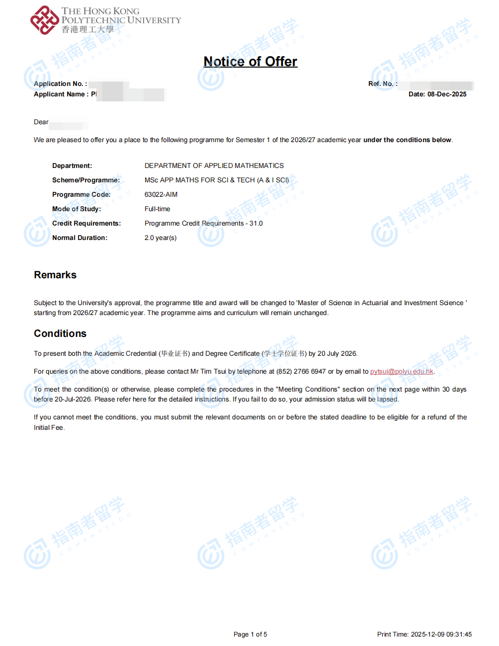 香港理工大学科技应用数学(精算及投资科学)理学硕士研究生offer一枚
