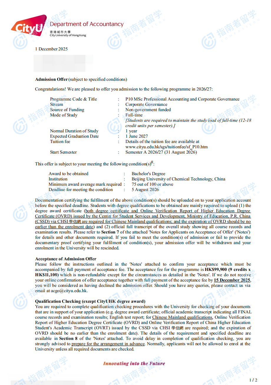 香港城市大学专业会计与企业管治理学硕士研究生offer一枚