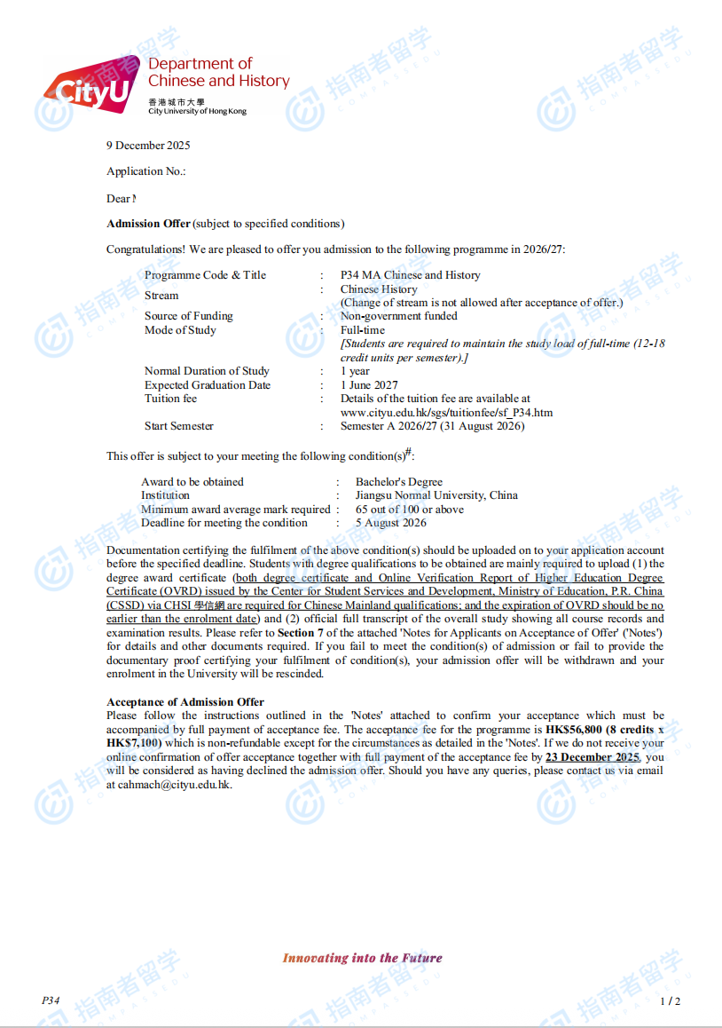 香港城市大学中国语言文学与历史文学硕士研究生offer一枚
