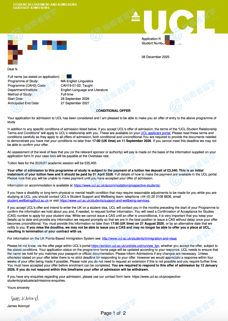 伦敦大学学院英语语言学文学硕士研究生offer一枚
