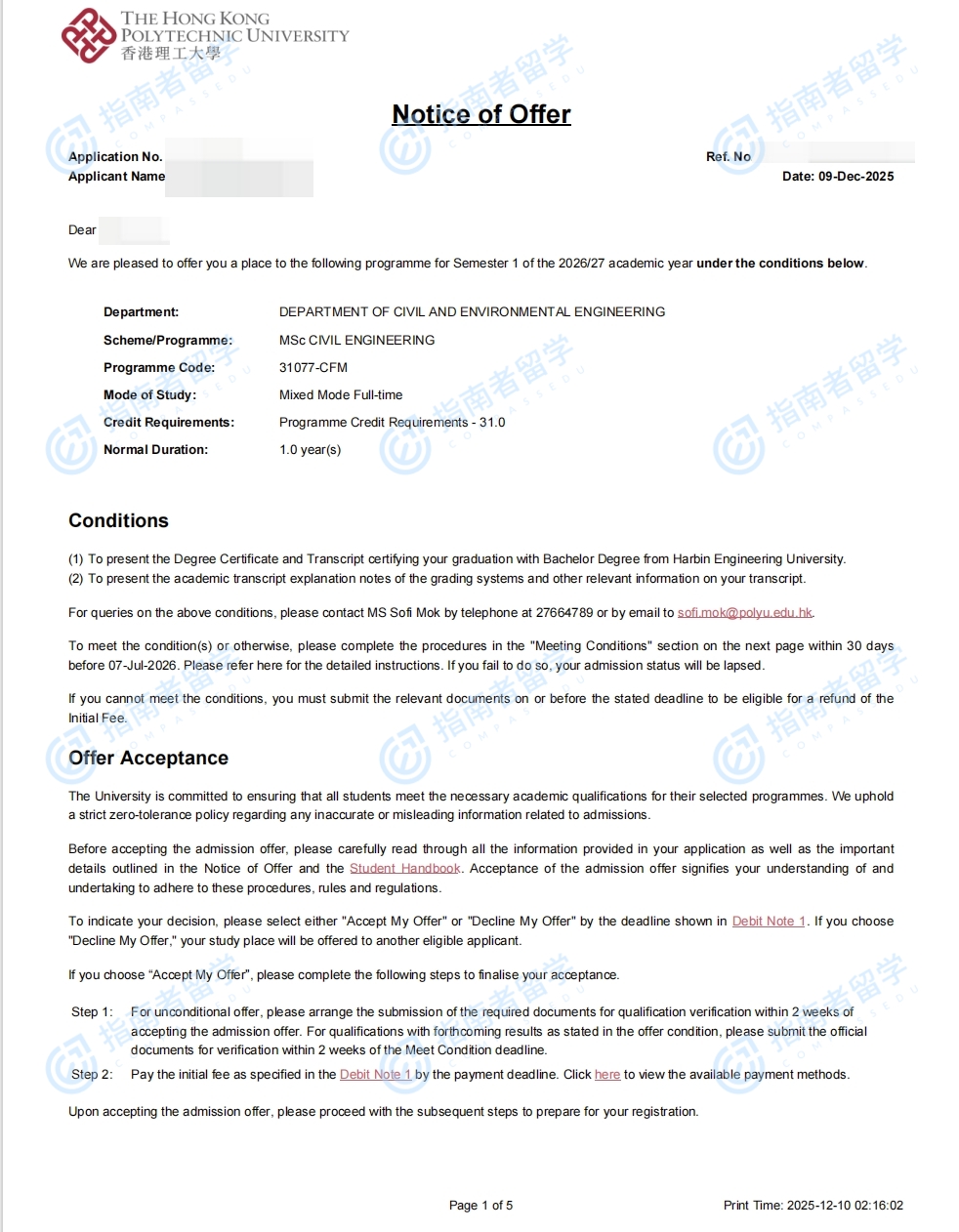 香港理工大学土木工程学理学硕士研究生offer一枚