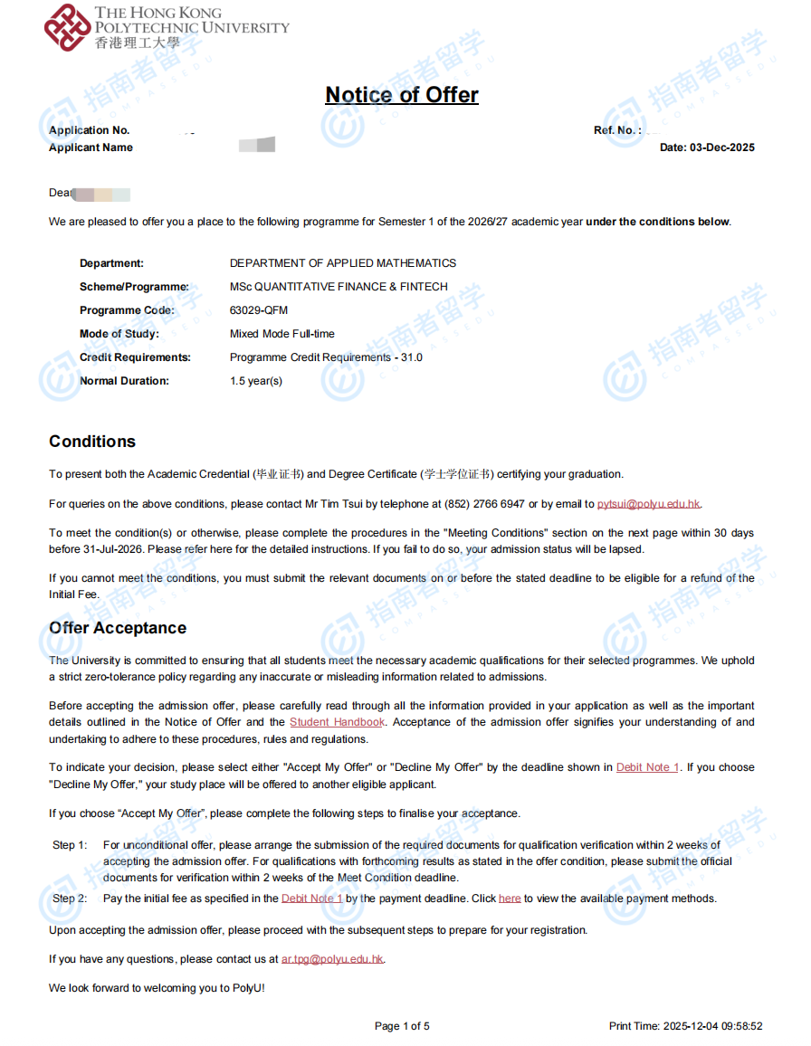 香港理工大学量化金融与金融科技理学硕士研究生offer一枚