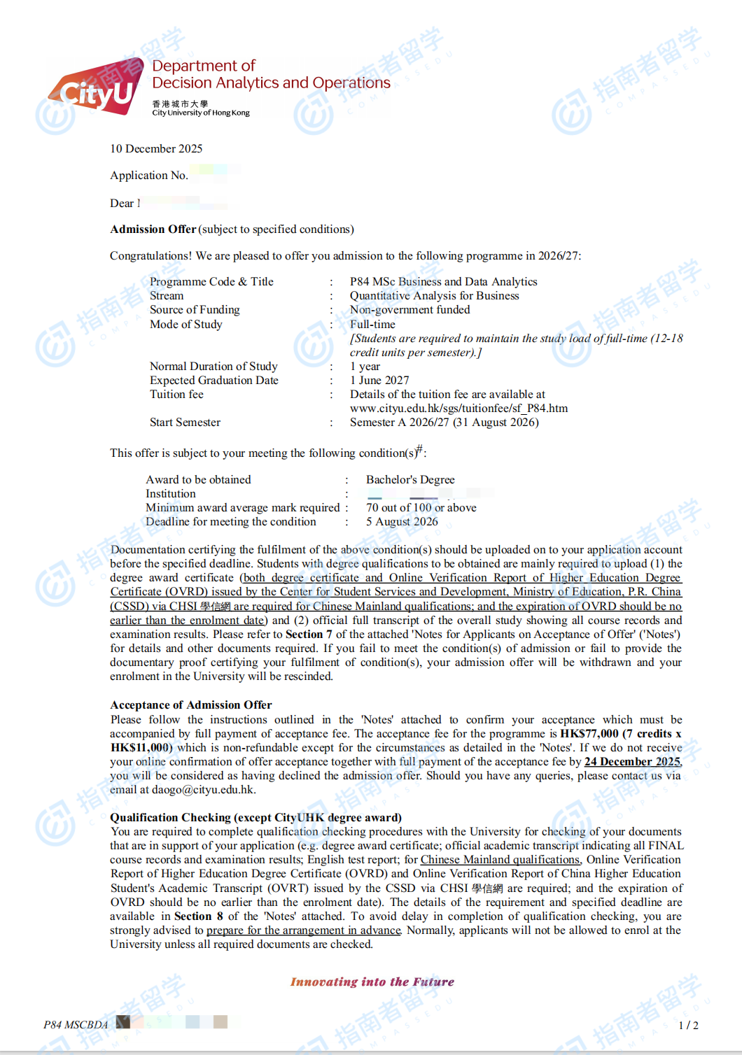 香港城市大学商业及数据分析理学硕士研究生offer一枚