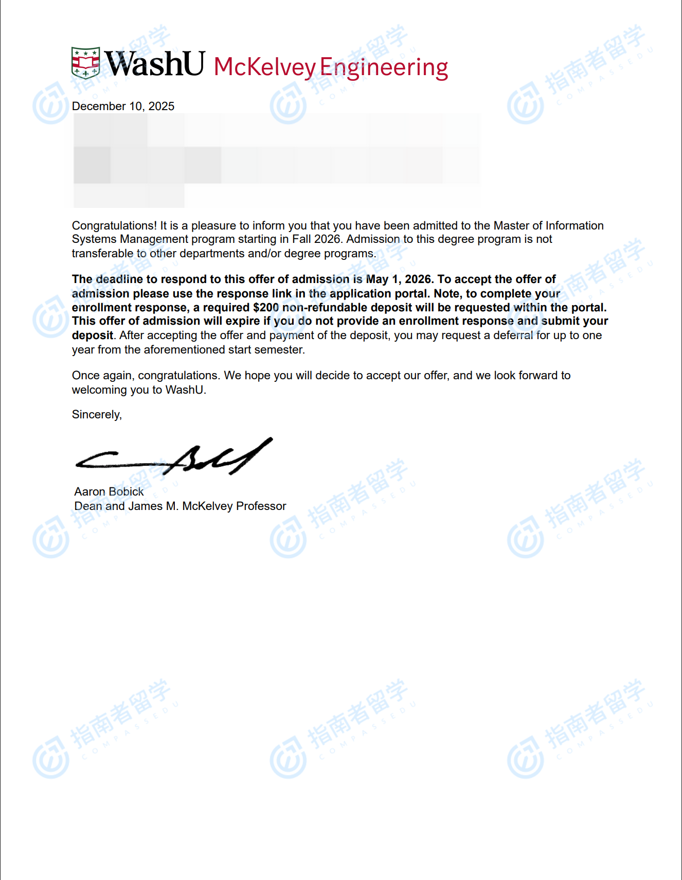 圣路易斯华盛顿大学信息系统管理硕士研究生offer一枚